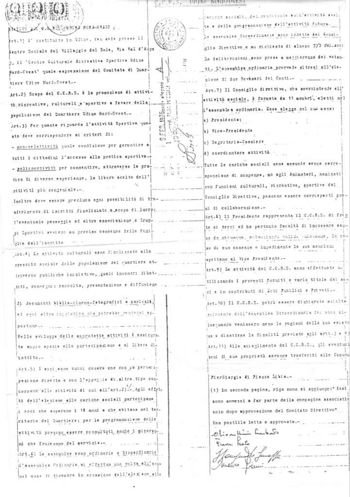 Sono passati tanti anni e con gli anni se n’è andata anche una parte di memoria … per fortuna qualcuno è stato più ordinato e meticoloso di me e tra le carte ha conservato una copia dello Statuto del Centro Culturale Ricreativo e Sportivo di Udine Nord-Ovest.