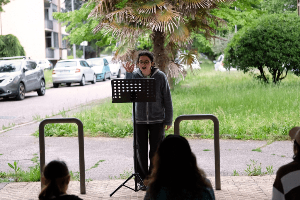 Dopo la prima lettura all’aperto svolta sotto i portici del Villaggio del Sole abbiamo pensato di proporre un’altra performance di lettura itinerante e poi uno spettacolo finale. Al primo evento i/le partecipanti si sono cimentatə nella lettura di una poesia che permettesse di avvicinarsi all’improvvisazione attraverso i gesti e le parole, ma soprattutto si è trattato di un esperimento che attraverso la voce rendesse vivo lo spazio circostante. Al prossimo evento saranno protagoniste due persone che piano piano sussurreranno tra le strade del Villaggio…. per avvicinarci poi all’evento finale! Non possiamo dire di più!